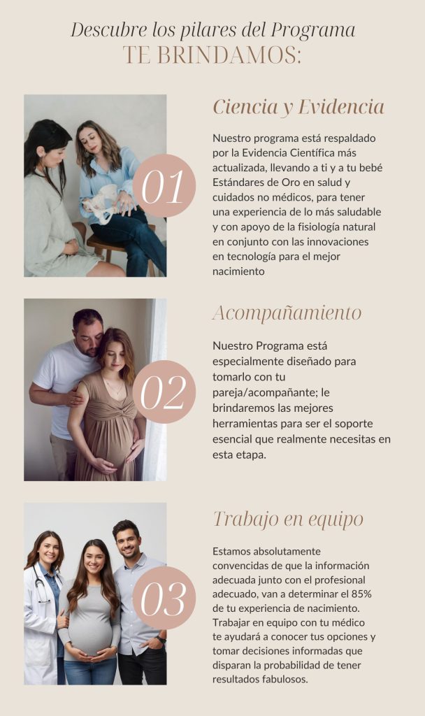 Nuestro Curso Integral te prepara para un parto seguro, saludable y amoroso, con herramientas basadas en Ciencia y con estándares de ORO para la salud de tu bebé. En este proceso, tu pareja o acompañante será tu mejor apoyo: juntos aprenderán a acompañar el nacimiento de su bebé con calma, seguridad y mucha, mucha conexión.